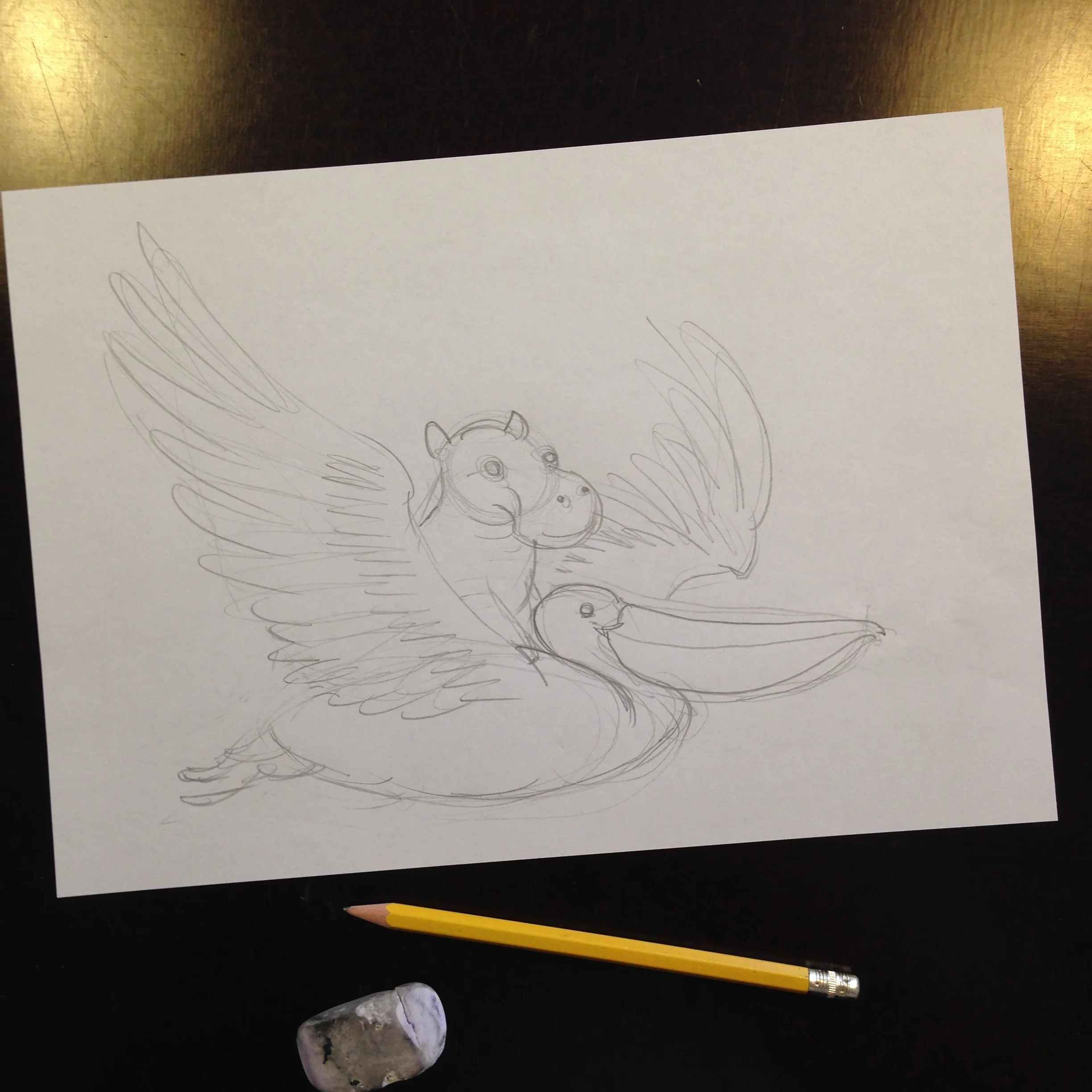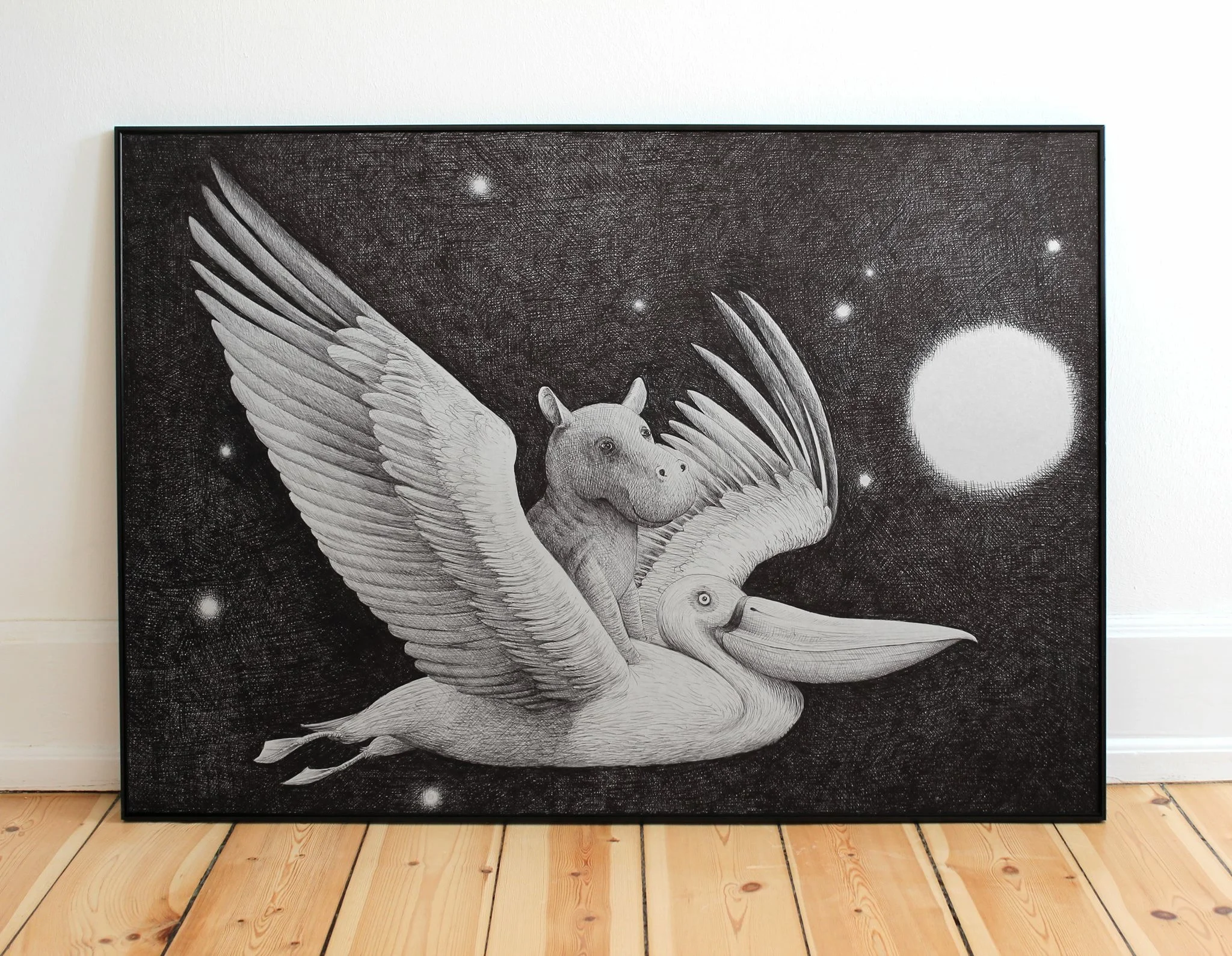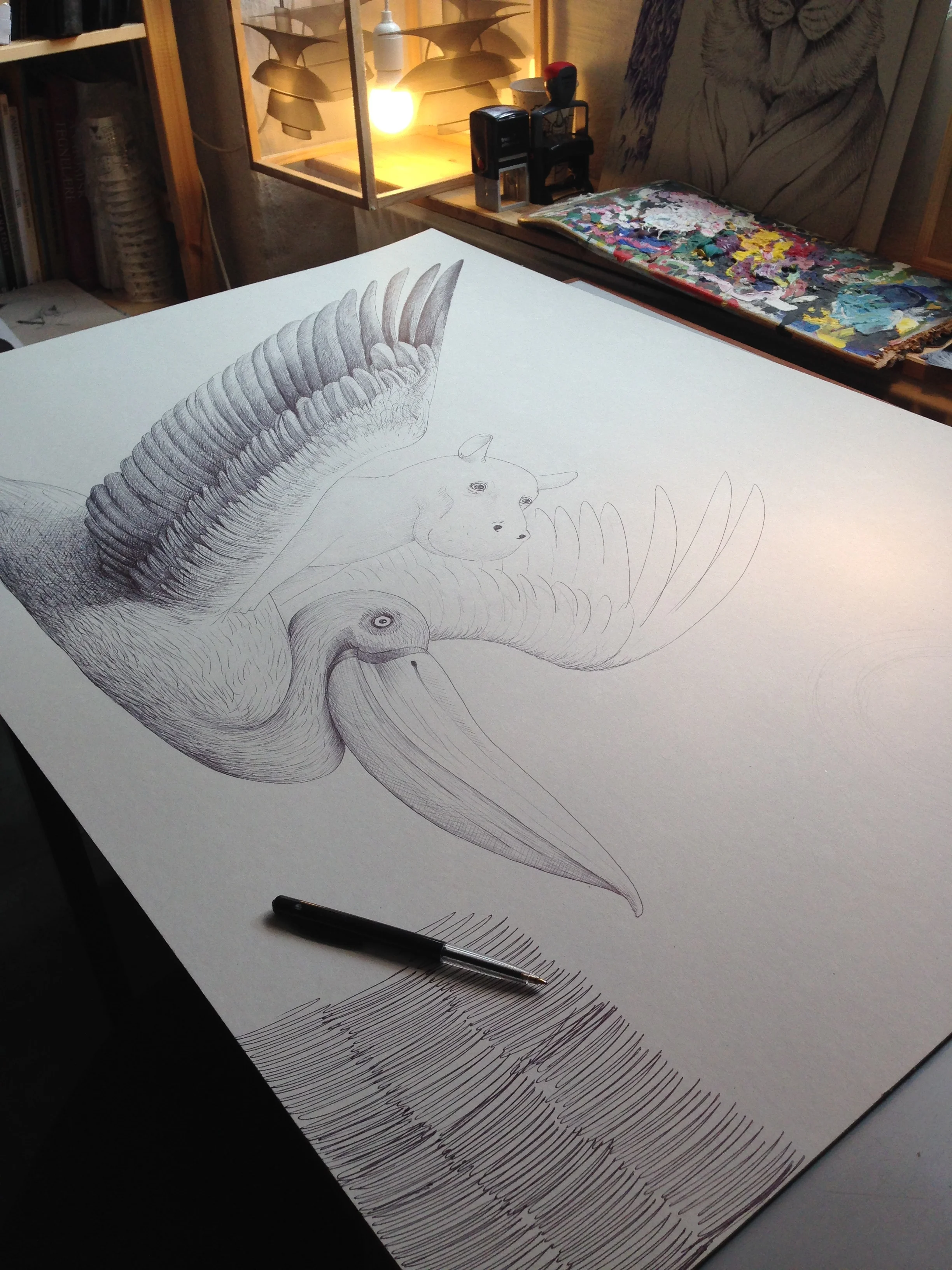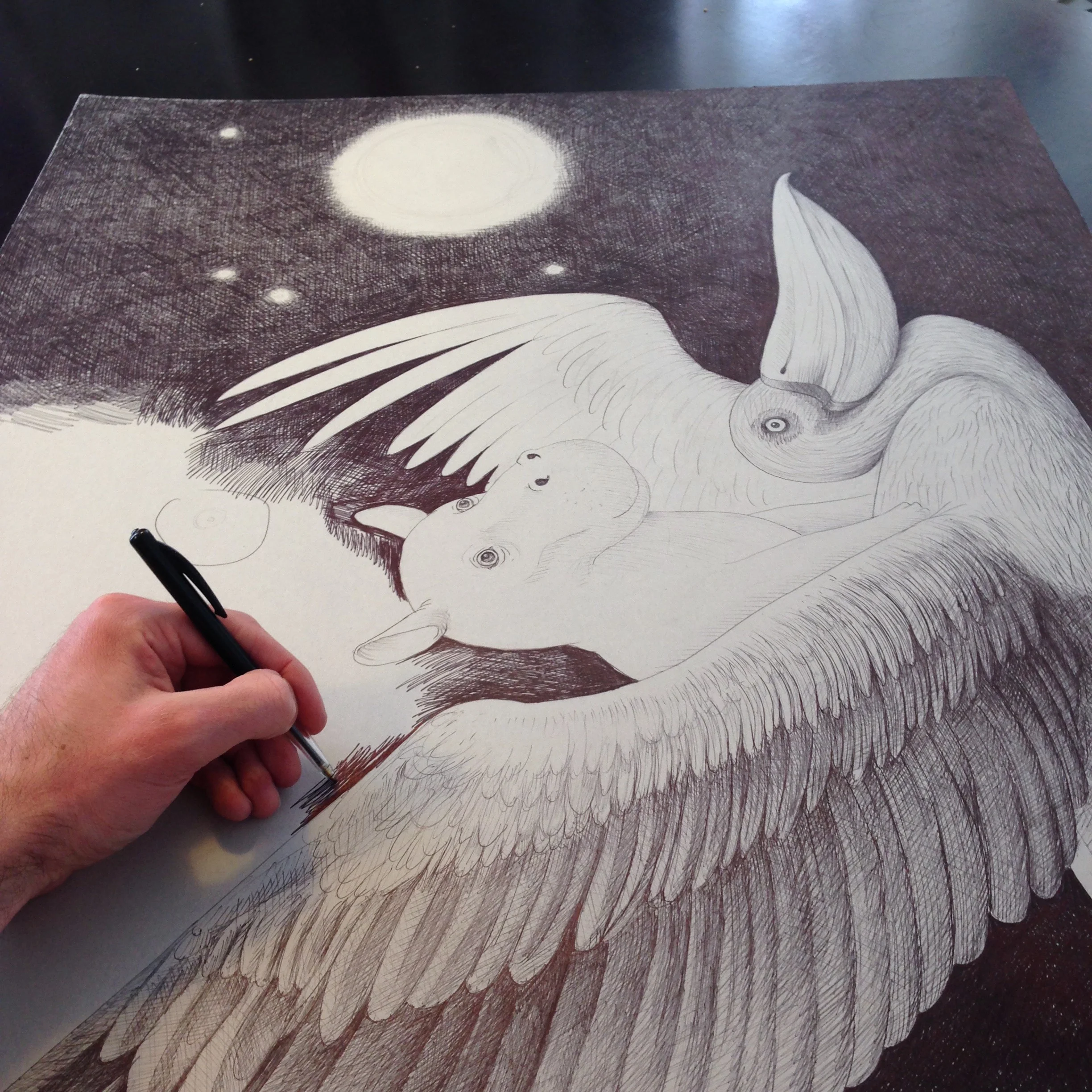 I wanted to create a dreamy night drawing that illustrates the longing for adventures. I chose a pelican and a baby hippo, a very odd couple. I did some sketch work and ended up with the crude sketch four pictures above. I then grabbed the ballpoint pen and started on the real drawing which I chose to do in 100x70 cm. The bigger the better. First I did the out line to make sure that every thing was in the right place. I then started drawing the wing and the pelican feathers followed by the hippo. I saved the background work til last. Drawing the entire black background took me 3-4 weeks of (on-and-off) work. A lot of work!